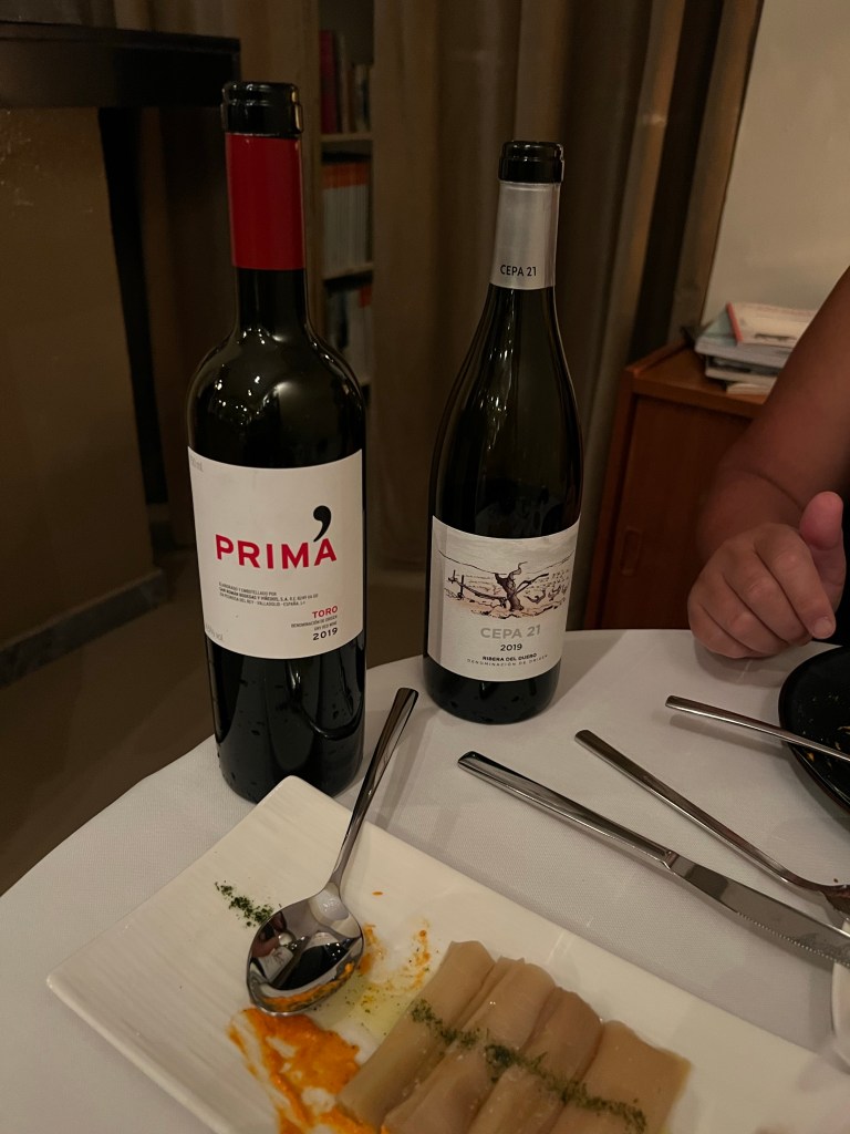 Our maitre-de/waiter/owner of this small (10-12 tables) wine bistro was the best guide for this short journey through Spanish wines. He sensed my enthusiasm and suggested that I try half-glasses so I could try a variety of wines. What a guy. Ok, so he brought two bottles to the table to sample from these two Tempranillo-based wines. (ok, to say “Tempranillo-based wines” in Spain really isn’t narrowing things down….Tempranillo is the grape for Spain’s most renowned red wines, e.g. Rioja, Ribera del Duero, Toro).