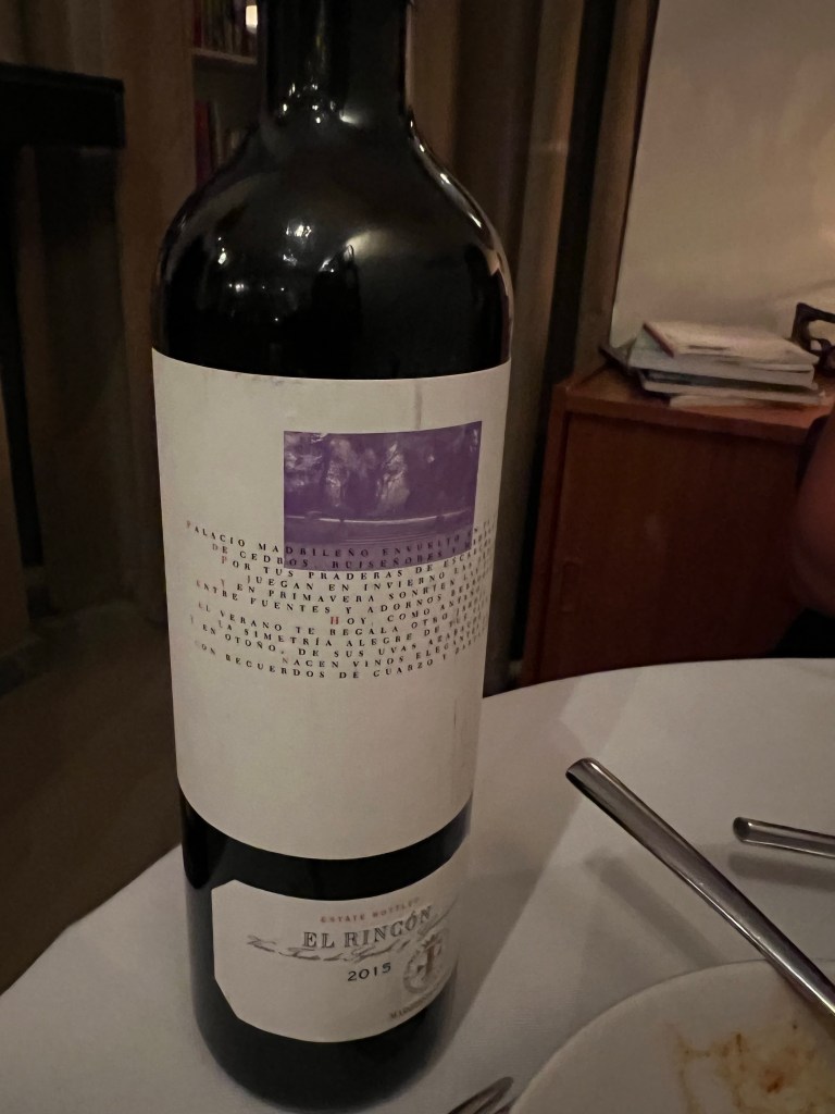 This left me some capacity to try another half-glass of another red, this time a Syrah-based wine from nearby vineyards in Mardrid, which are not really well known in the US. Damn, Spain makes sooooo many amazing wines, and are possibly the best bargains for high-quality wines in the world. Not hardly exaggerating! anyways, back to the “El Rincon”…Syrah grapes with a small percentage of Garnacha (aka Grenache). Delicious, well-balanced, rich deep raspberry/cherry on the nose and palate, silky finish, medium tannins and just plain delicious.