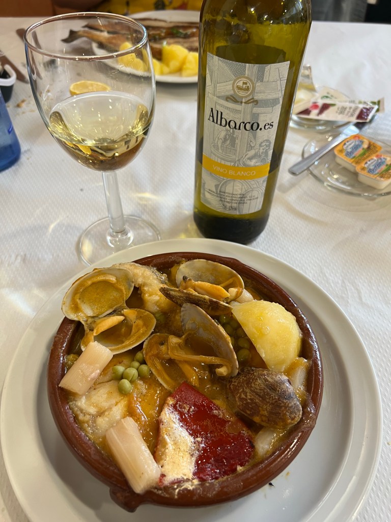 It looked, smelled, and tasted like some thing that mom would make… And of course at that age, when I was a kid, I didn’t appreciate at all. Tomatoes, onions, peas, potato and a big hunk of hake (what an unfortunate name for merluza, an otherwise delicious, meaty fish) along with a few clams. That, and a cheap €3 bottle of local white.